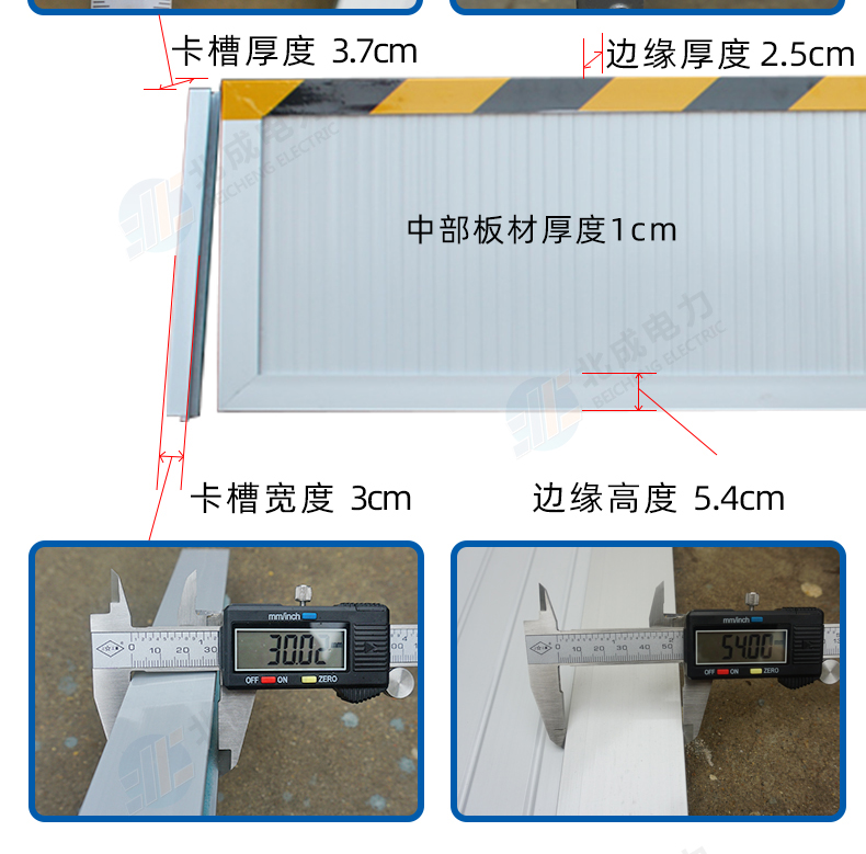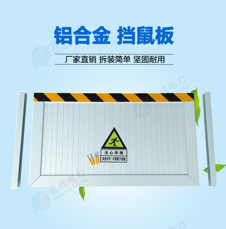 新型鋁合金材質擋鼠板替代老式擋鼠板材,實用、結實、耐用、使用時間長。由擋鼠板主板面和卡槽夠成,外觀可見部分為鋁合金定制,且貼有黃黑色的反光警示貼。